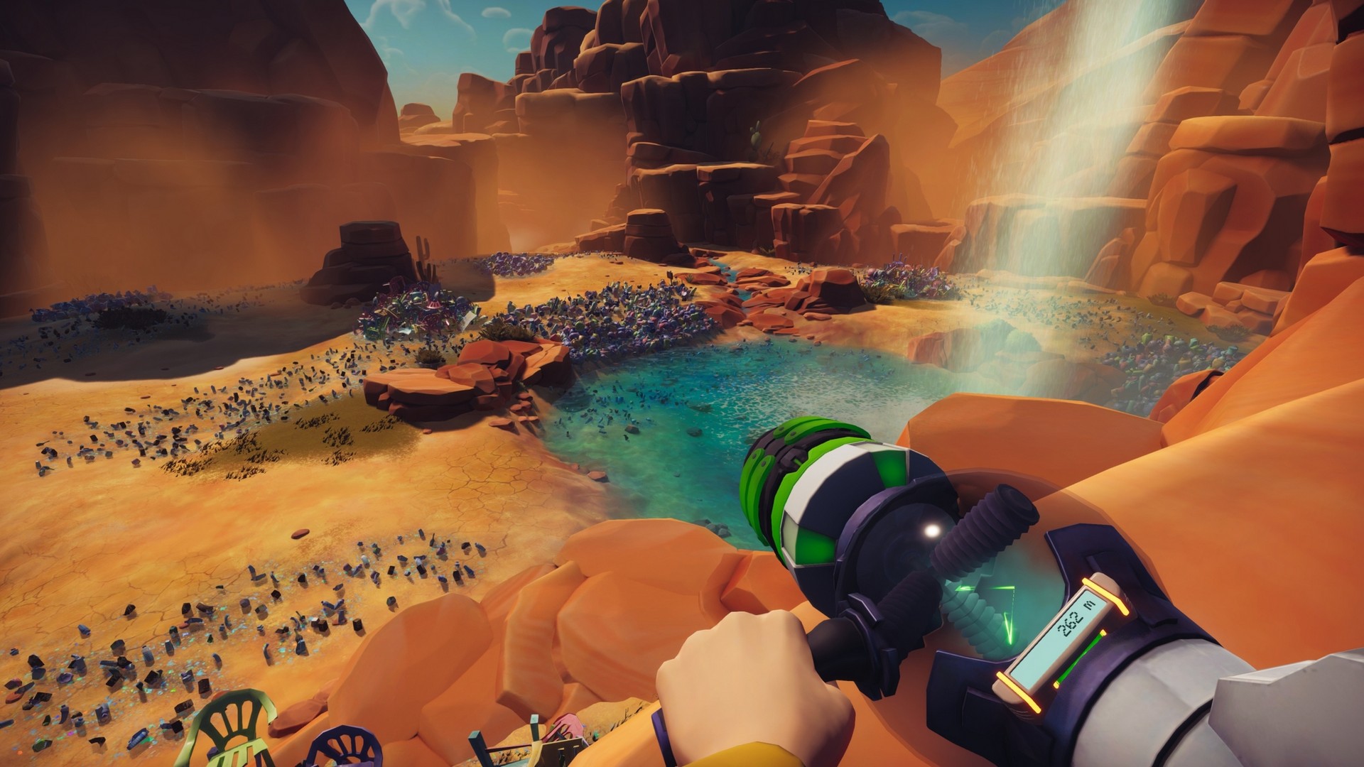 All'inizio abbiamo solo l'ugello base attaccato al nostro Terra Cleaner, che ci permette di aspirare rifiuti leggeri e piccoli contando però su un ampio raggio d'azione. Ma per gli oggetti più pesanti ci servirà l'ugello di precisione, mentre l'Archeo ci consentirà di tirar fuori i rifiuti interrati e un altro modello ancora ci farà trattare i rifiuti radioattivi (abbiamo disseminato anche quelli nel corso dei secoli). Fondamentalmente si tratta solo di montare l'accessorio giusto (RB e LB) se lo abbiamo disponibile oppure dovremo recuperarlo sullo scenario, e aspirare il tutto. Un indicatore ci dirà quanti chilogrammi (o quintali) di rifiuti ci sono in quella determinata area e, ovviamente, la nostra missione sarà quella di portare quell'indicatore allo zero.