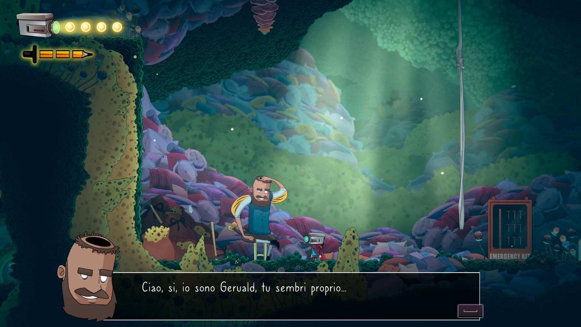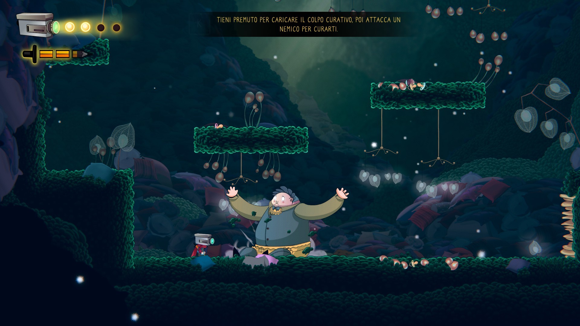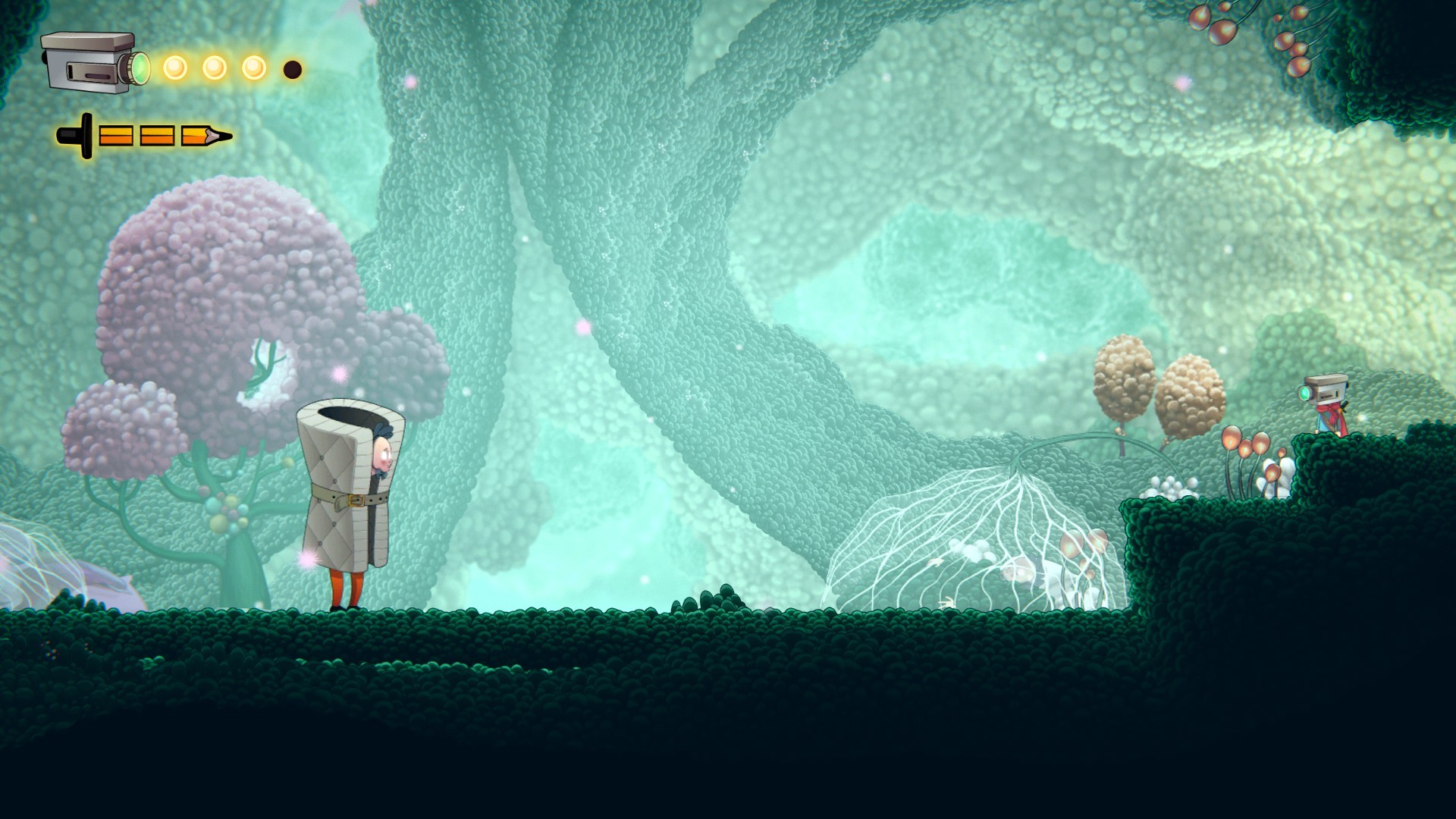 Molto interessante l'idea degli indovinelli che ci svelano punti nascosti - anche al radar dello scanner - da rivelare per sbloccare nuove risorse e collezionabili. Carina la scatola delle medicine che si apre… una volta recuperata la giusta chiave (ehm non vi diciamo come. -NdR). Così come è carina l'idea del ladro che ci ruba alcune Babls (le sfere fluorescenti da usare poi come moneta locale) non appena moriamo e che dovremo recuperare al più presto (fortunatamente non è difficile). Dal menu di pausa poi si accede alle varie opzioni: mappa, inventario, filamenti, tesori e poteri ognuna delle quali occupa (graficamente) uno spazio di un ipotetica videocamera... che poi è la nostra testa. Ci sono, insomma, tanti piccoli spunti carini che misti alle metafore presenti nel gioco agli ambienti ottimamente disegnati e colorati e all'accompagnamento adeguato di una valente colonna sonora, rendono tutto il gioco interessante dall'inizio alla fine.