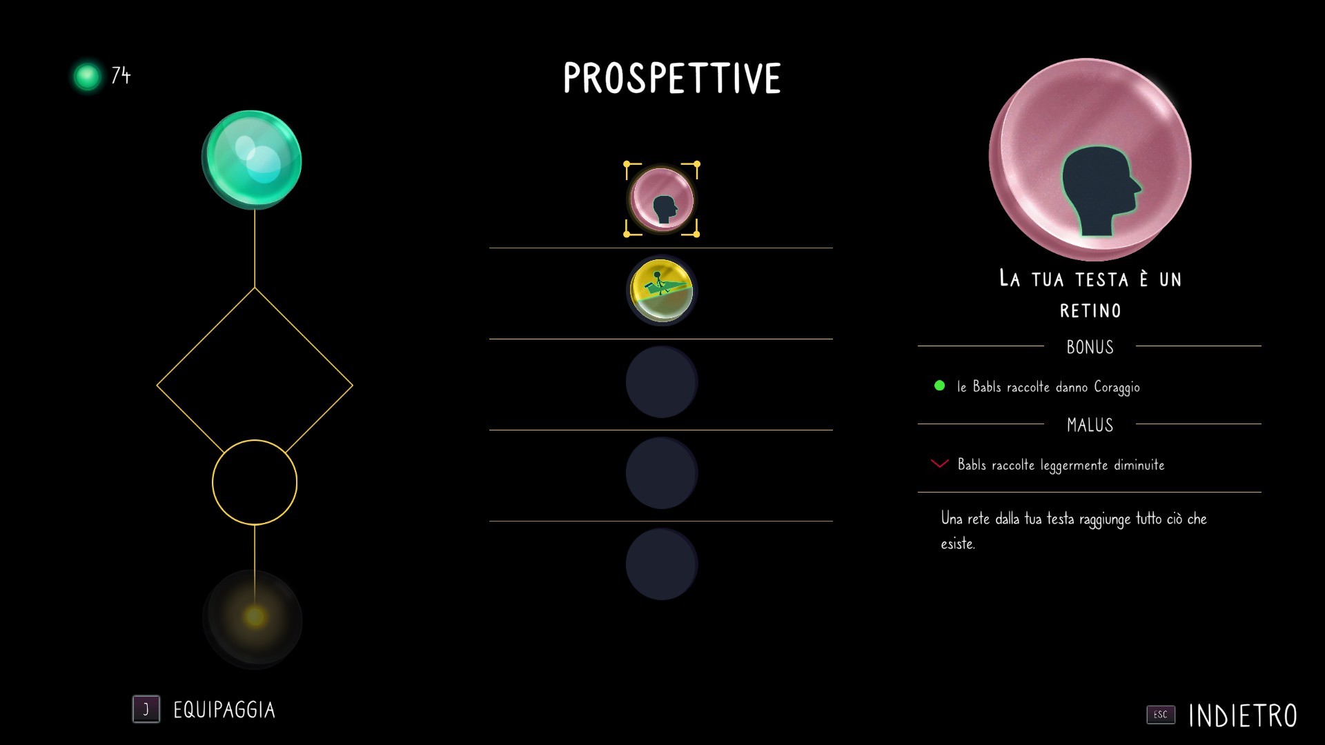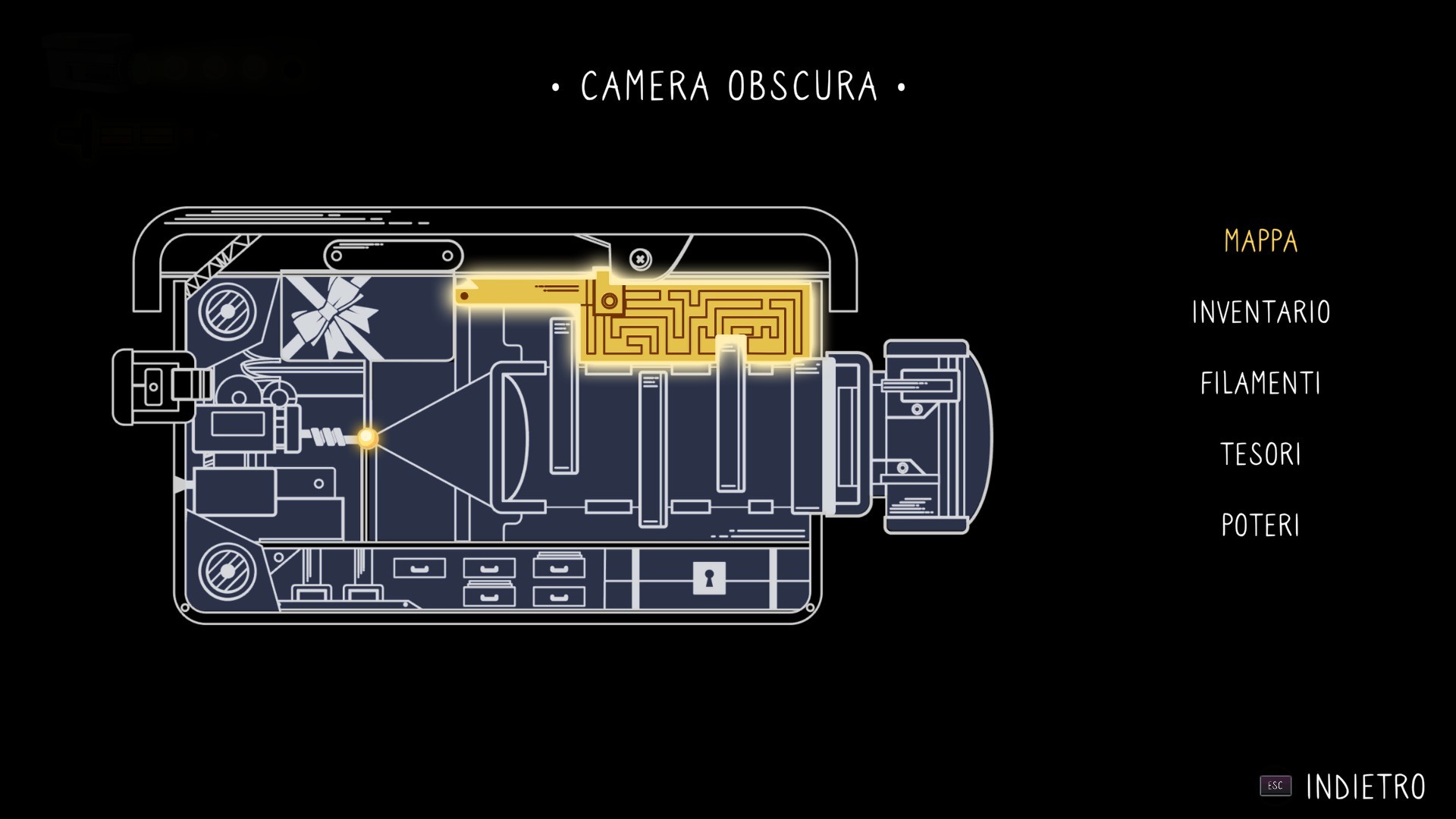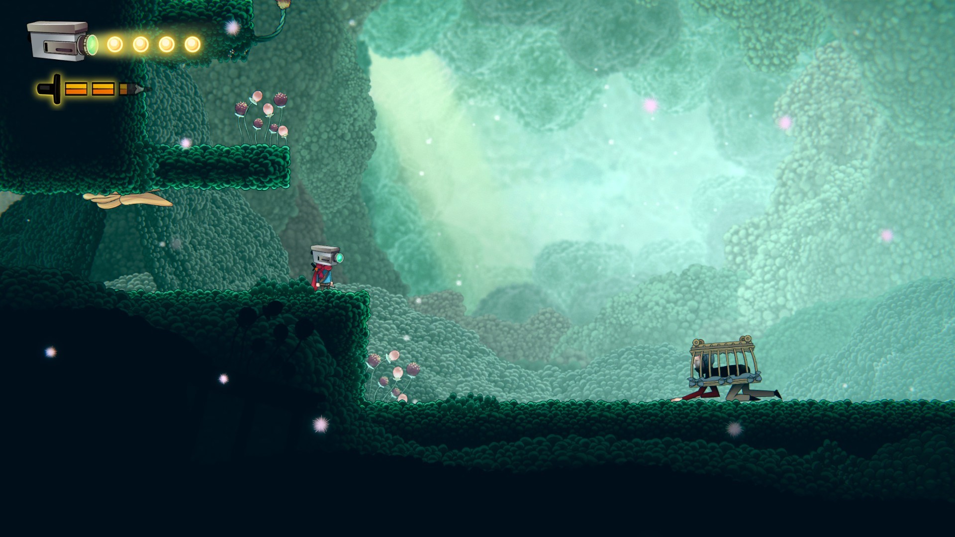 Molto interessante l'idea degli indovinelli che ci svelano punti nascosti - anche al radar dello scanner - da rivelare per sbloccare nuove risorse e collezionabili. Carina la scatola delle medicine che si apre… una volta recuperata la giusta chiave (ehm non vi diciamo come. -NdR). Così come è carina l'idea del ladro che ci ruba alcune Babls (le sfere fluorescenti da usare poi come moneta locale) non appena moriamo e che dovremo recuperare al più presto (fortunatamente non è difficile). Dal menu di pausa poi si accede alle varie opzioni: mappa, inventario, filamenti, tesori e poteri ognuna delle quali occupa (graficamente) uno spazio di un ipotetica videocamera... che poi è la nostra testa. Ci sono, insomma, tanti piccoli spunti carini che misti alle metafore presenti nel gioco agli ambienti ottimamente disegnati e colorati e all'accompagnamento adeguato di una valente colonna sonora, rendono tutto il gioco interessante dall'inizio alla fine.