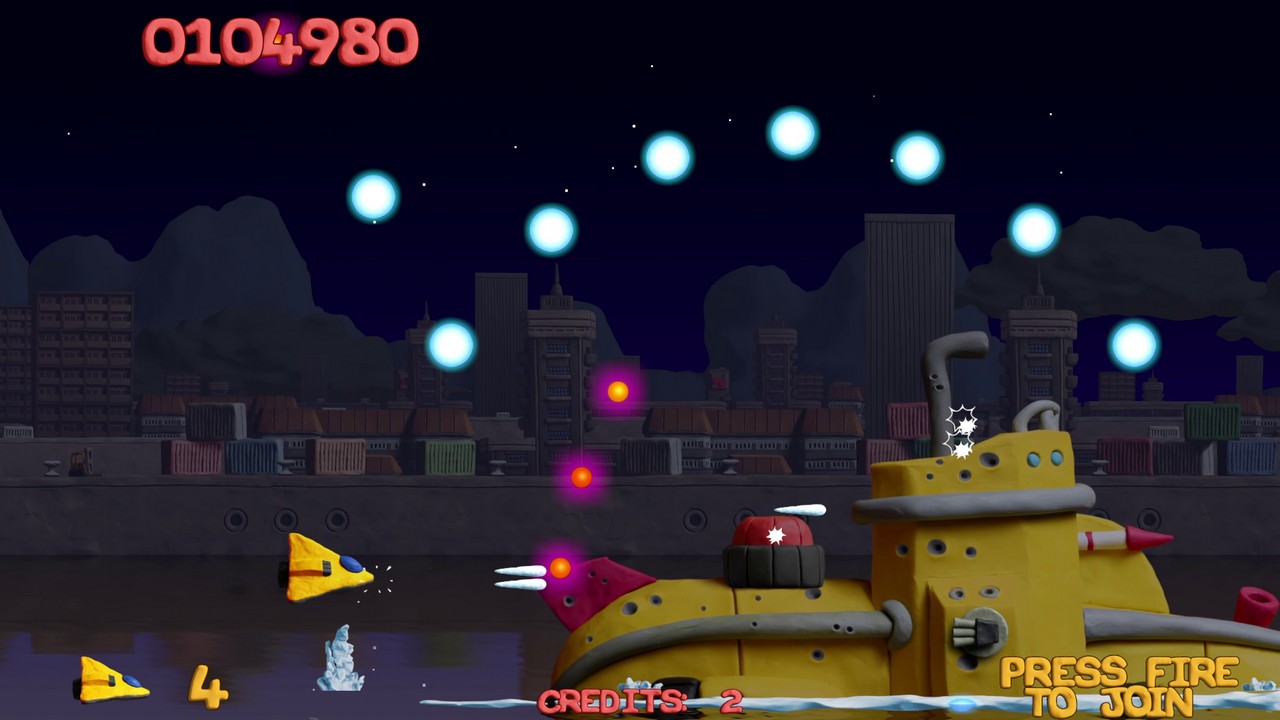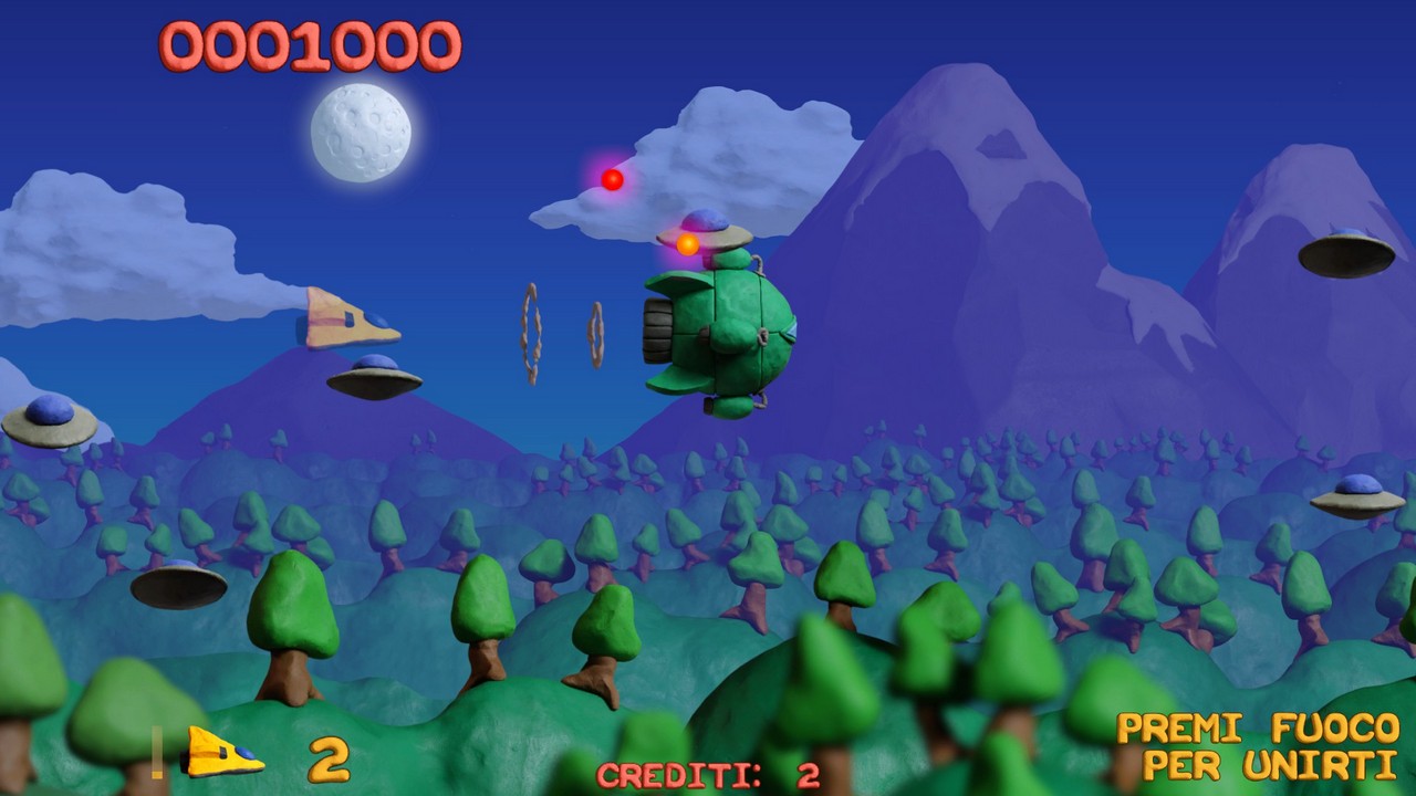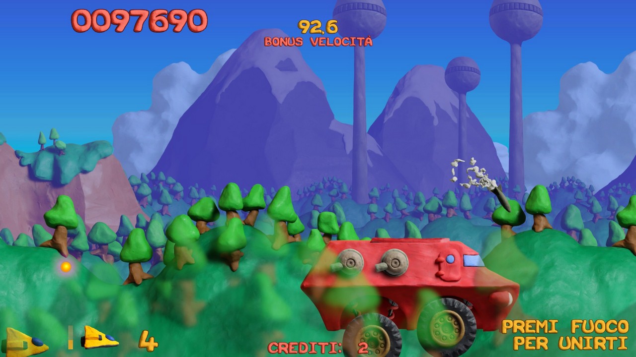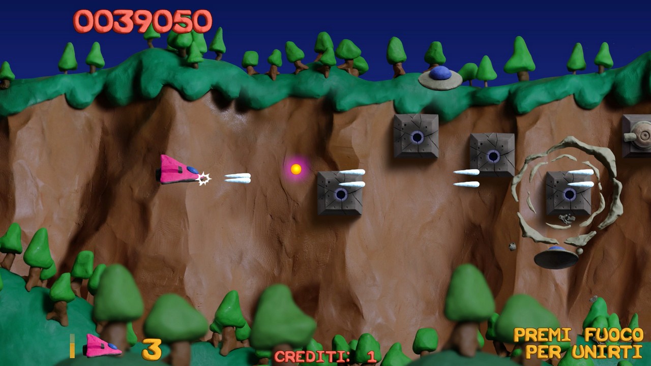 E questo lavoro permea in ogni parte del gioco, dai proiettili sparati ai danni creati agli avversari che vedremo sfaldarsi pian piano prima di esplodere al parallasse sullo sfondo: un'intera avventura di plastilina, coerente anche nella scelta dei colori appositamente adattati. Per quanto riguarda la storia, in realtà in uno shoot'em up la trama di gioco ha sempre un ruolo marginale anche se qui riusciamo a trovarne una appena abbozzata, che ci porta nella città di Collosatropolis e nelle sue guerre con la vicina città di Mungola.
