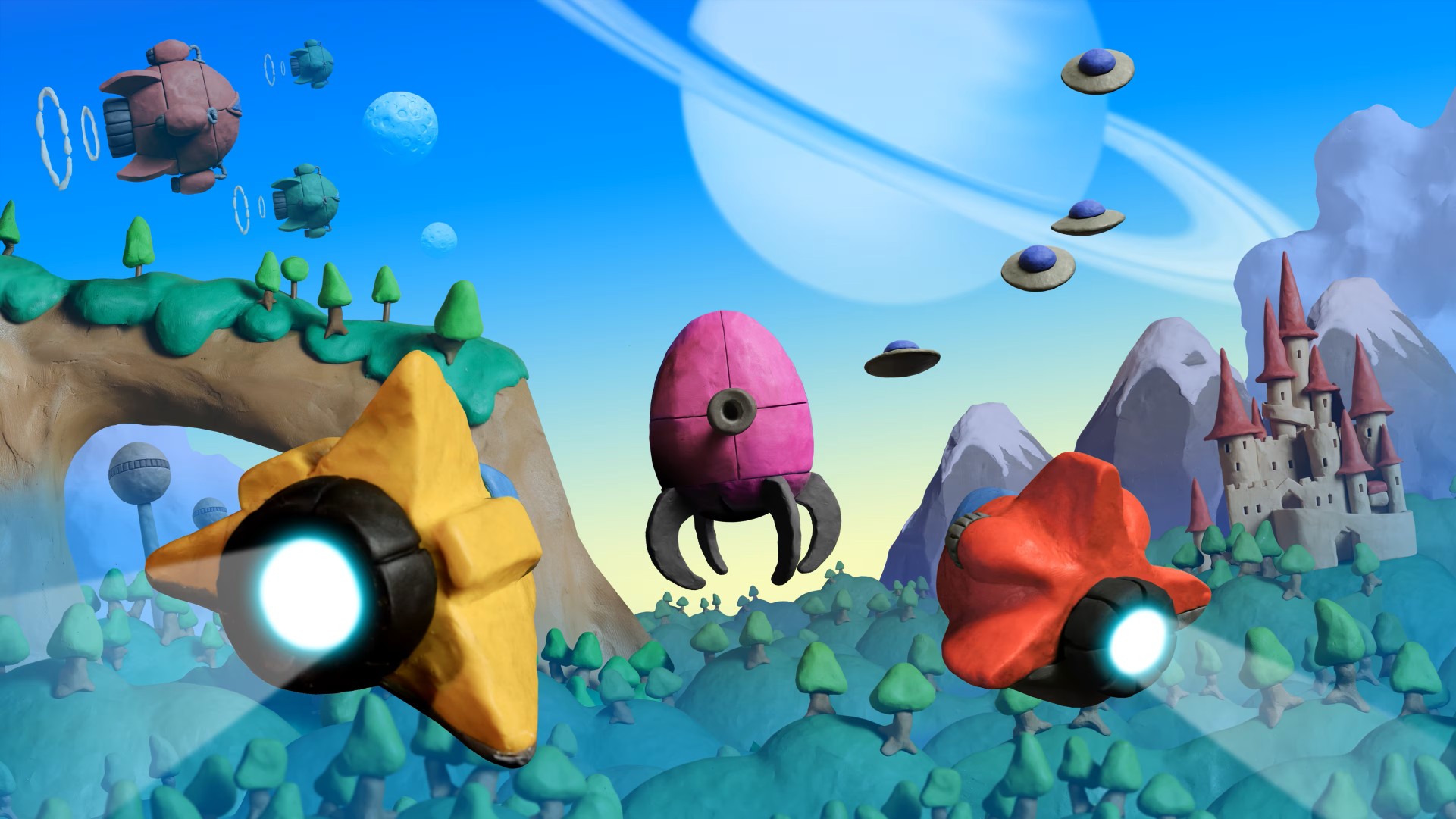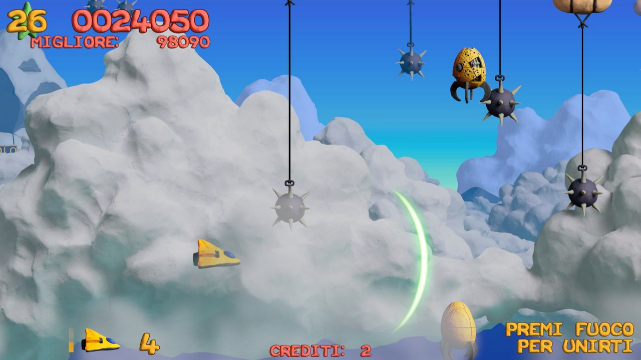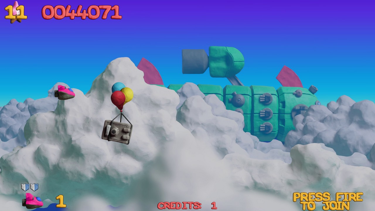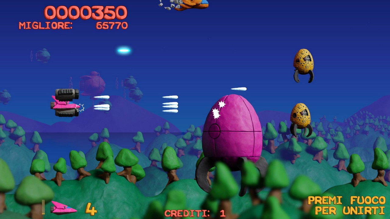 E questo lavoro permea in ogni parte del gioco, dai proiettili sparati ai danni creati agli avversari che vedremo sfaldarsi pian piano prima di esplodere al parallasse sullo sfondo: un'intera avventura di plastilina, coerente anche nella scelta dei colori appositamente adattati. Per quanto riguarda la storia, in realtà in uno shoot'em up la trama di gioco ha sempre un ruolo marginale anche se qui riusciamo a trovarne una appena abbozzata, che ci porta nella città di Collosatropolis e nelle sue guerre con la vicina città di Mungola.