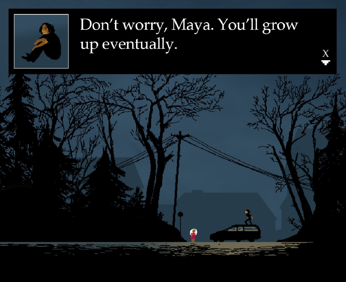 Dopo aver superato la fase del platform di precisione, improvvisamente il gioco cambia genere divenendo una vera e propria avventura grafica in prima persona. Vedremo una schermata, quasi d'altri tempi, semplificata per interagire con l'ambiente tramite dei comandi testuali come Look, Talk, Use e Move. Cominceremo dalla stanza dagli occhi di Maya, scoprendo le abitudini familiari e le sue passioni. Ci muoveremo tra la casa fino alla sala da pranzo, dove la famiglia è riunita per mangiare. Nostra madre sembra avere un comportamento un po' strano, molto insistente e poco naturale.