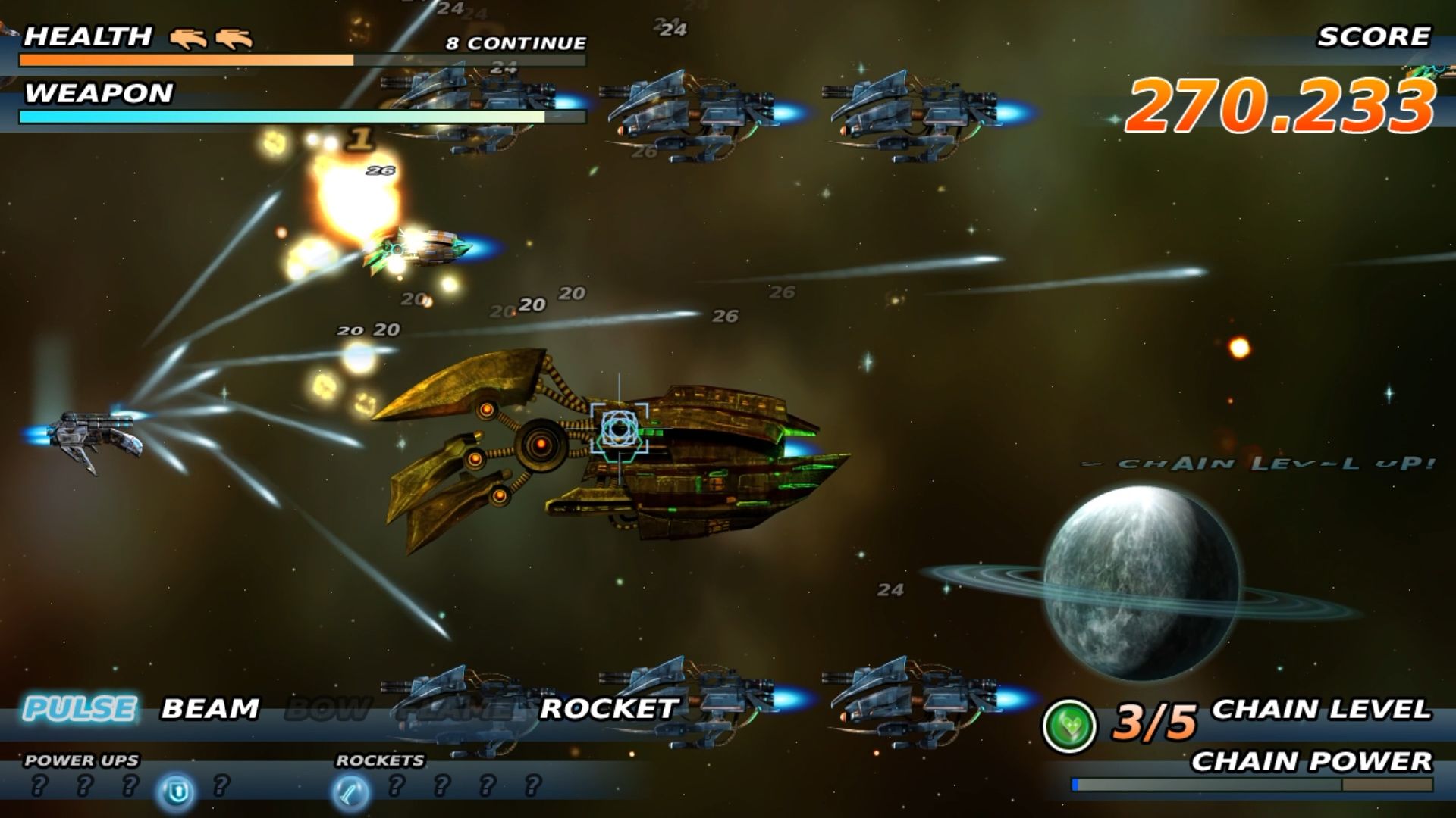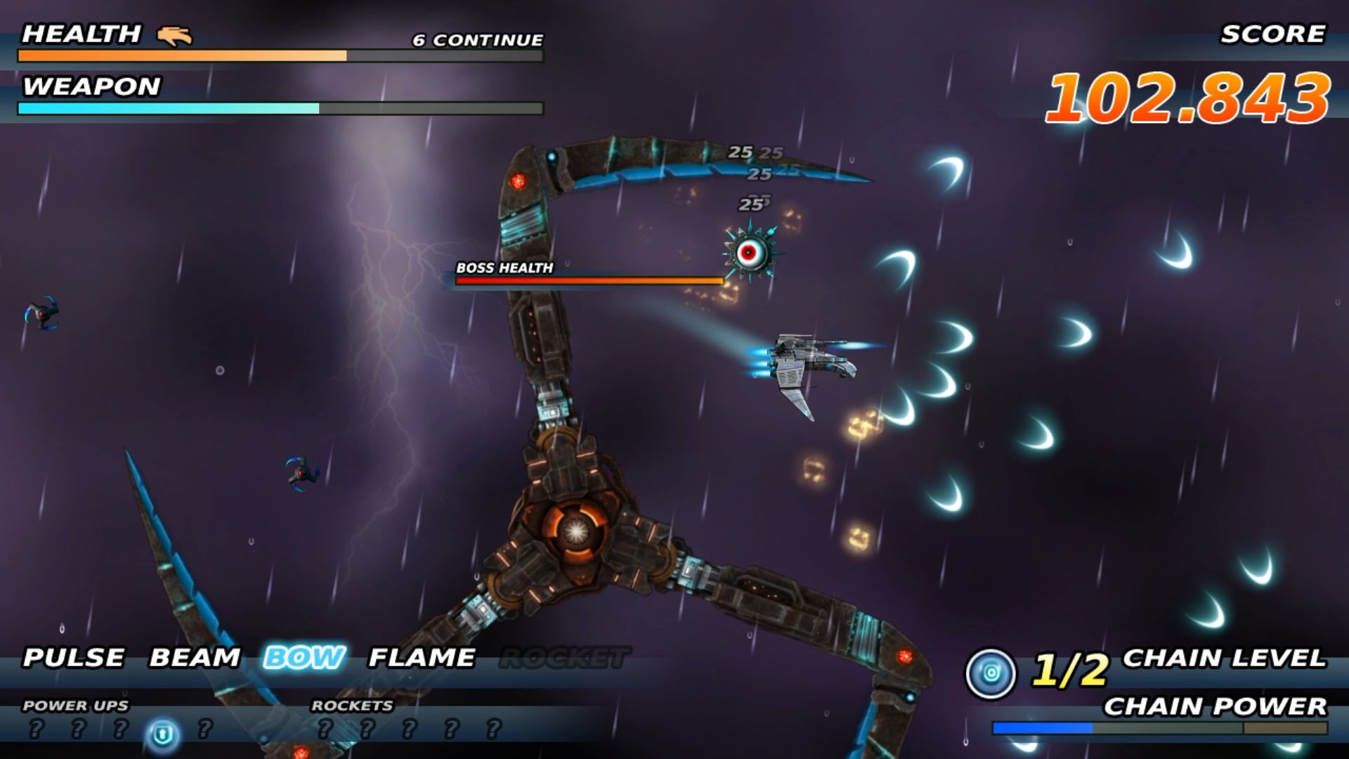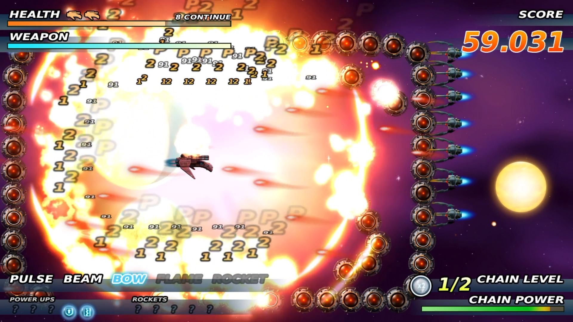Se avete letto la recensione originale (l'avete fatto, vero?!), non andiamo ad approfondire questo aspetto. Vi diciamo che la nostra nave disporrà di cinque armi principali, due delle quali ottenibili più avanti. In più ci saranno dei bonus come l'incremento della velocità di sparo temporaneo, punti aggiuntivi ed una maggiore velocità dell'incremento della barra della catena così come i malus che renderanno la vita difficile come ad esempio un decremento della velocità. Man mano che questi verranno presi, il tutorial si aggiornerà spiegandoli per filo e per segno.