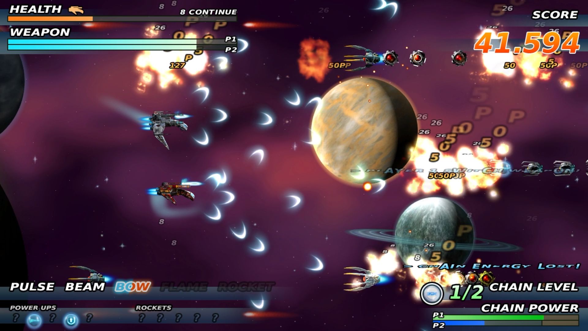 La caratteristica peculiare della nave è quella di avere una barra di energia, non lontana dai giochi di ruolo, che calerà più o meno rapidamente a seconda di quanti danni subiremo dal fuoco nemico, sbattendo su alcuni punti dello scenario e in base alla difficoltà scelta. Alcuni dei bonus più gettonati saranno quelli verdi raffiguranti un cuore, i quali ripristinano una porzione dell'energia della nave. Se andremo sotto una certa soglia con l'energia si attiverà il berserker mode, con il fuoco della nave che farà più danni. Tale modalità s'interromperà se la barra di energia verrà incrementata o verremo distrutti, perdendo una delle tre vite a disposizione. I boss di fine mondo hanno i loro pattern d'attacco che andranno studiati per avere la meglio. Una volta concluso il relativo mondo verrà analizzata la nostra prestazione con tanto di valutazione che va da C (rookie) a S (ultimate).