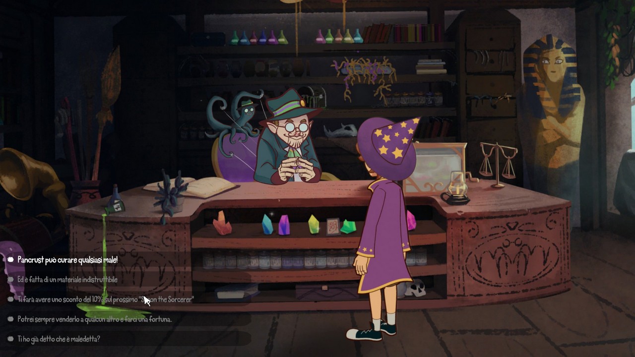 Ci recheremo al vicino villaggio nel tentativo di procurarci la via d'accesso per l'Accademia di Magia del luogo, il posto ideale dal quale partire dato che parliamo comunque di pozioni, incantesimi e compagnia cantante. Nel frattempo incontreremo tantissime persone, alcune messe lì tanto per comparsa (tipo il troll con i fiori o i bambini che giocano in piazza), altri invece importantissimi per proseguire nella storia, tutti ottimamente caratterizzati. Pur facendo di tutto per evitare fastidiosi spoiler (e non è semplice) non si può non citare lo strano oste della locanda Bloated Goat Inn, l'ancor più ambiguo prete della chiesa, il curiosissimo Paludoso per non parlare del misterioso Mundus' Magic Shop, un negozio che sembra preso in prestito da Safarà (di Dylan Dog) e gestito da una strana marionetta animata da un polpo. Personaggi, comunque, per buona parte già noti a chi ha seguito poi tutta la saga di Simon the Sorcerer.