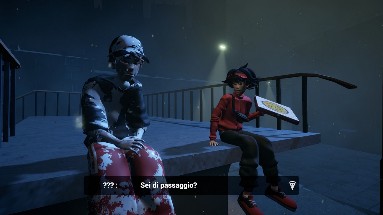 Inizia quindi il nostro percorso tra semplici, ma non sempre ben implementati, piccoli puzzle ambientali da risolvere e persone da incontrare in quel mondo che sembrerebbe un vero e proprio limbo dove ognuno è bloccato per qualche motivo particolare. Non aggiungeremo ulteriori dettagli alla trama anche perché vi toglieremmo il gusto di scoprirla da soli, ma i dialoghi vanno avanti affrontando temi via via più profondi e personali, partendo da problematiche di altri per tirare alla fine dei conti in ballo anche noi e il nostro modo di vedere le cose. Sotto questo punto di vista A Pizza Delivery fa un vero e proprio piccolo miracolo, riuscendo a trasmettere benissimo il senso di malinconia/oppressione che affligge i vari nostri interlocutori: in linea di massima i dialoghi con loro sono facoltativi, ma perderseli sarebbe un vero peccato.