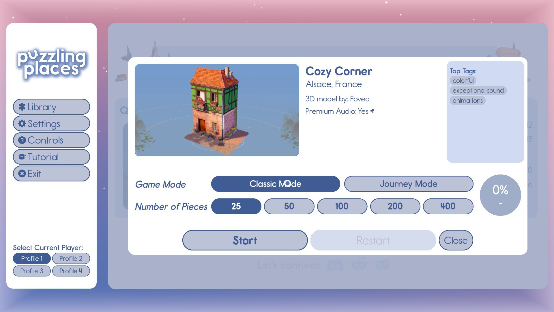 Naturalmente, riguardo al gameplay c'è molto poco da dire. Il menu presenta comunque tutte le opzioni che possono interessare: possiamo optare per la modalità classica e in questo caso ci ritroveremo tutti i pezzi del puzzle sullo schermo, oppure possiamo puntare sulla modalità journey che ci metterà a disposizione sei pezzi per volta. Inoltre potremo anche scegliere quanti pezzi devono comporre il puzzle con una difficoltà (naturalmente) direttamente proporzionale al numero dei frammenti. Una volta iniziato i controlli (manco a dirlo, con il mouse) sono semplicissimi. Il click sinistro ci permette di selezionare il pezzo, il destro di ruotarlo (siamo sempre in ambiente 3D) e la rotellina funziona per lo zoom.