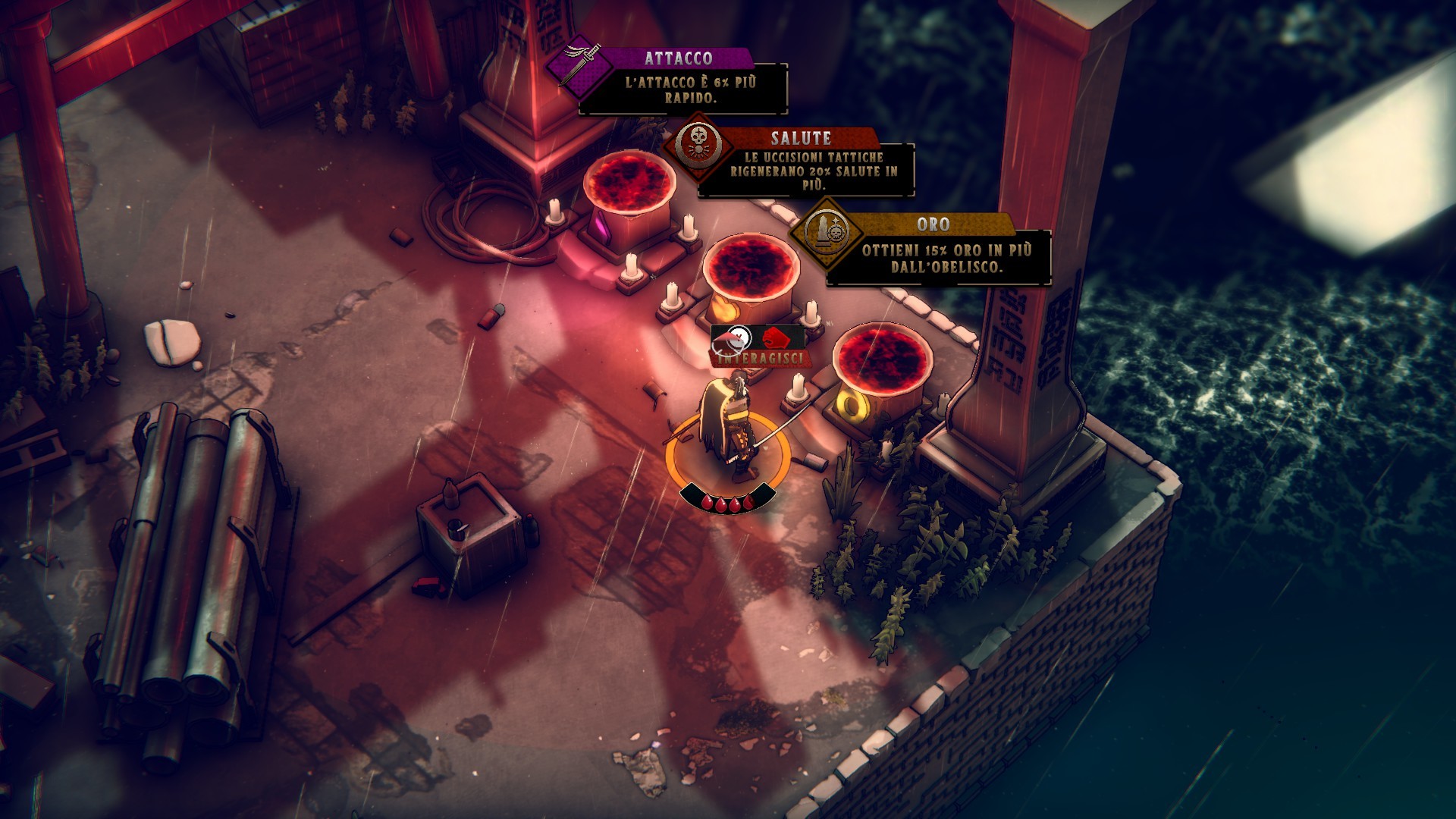 Oltre alla nostra affilatissima Katana che, con un po' di manualità, potremo utilizzare anche per parare e respingere i colpi degli avversari, troveremo in giro altri strumenti utili per "offendere" i cattivoni di turno, comprese delle pistole che, con la combinazione dei tasti LT e RT (uno per mirare e l'altro per sparare) ci permetteranno di colpire a distanza almeno fino all'esaurimento dei proiettili a disposizione. Molto importanti i pozzi che oltre ad attivare il checkpoint ci danno anche merci in cambio di monete, così come fa anche l'obelisco dannato che tuttavia, oltre ad attivare il checkpoint, ci fa scegliere un potenziamento pagando però qualcosa in cambio: oro maledetto (oro in cambio di un malus), cura maledetta (salute in cambio di un malus) e purificazione (che rimuove l'ultima maledizione ma rubandoci il 50% della nostra salute) sono solo degli esempi di come il gioco ci inviti continuamente alla ricerca di un nuovo equilibrio.
