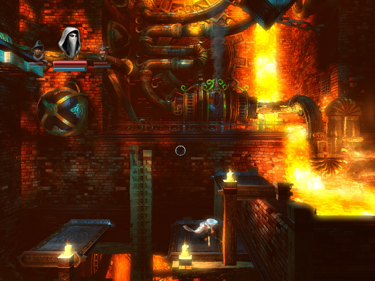 Durante il gioco ci troveremo spesso a avere a che fare con enigmi che sfruttano la fisica: non si contano i ponti mobili, le superfici da spostare, le ruote da mulino, le trappole con palle piene di spuntoni che ci cadono addosso, eccetera. Fortunatamente c'è abbastanza varietà da evitare la noia, e la possibilità di sfruttare soluzioni alternative (usando il mago) richiede un minimo di pianificazione per decidere qual'è il modo migliore per passare. Molti passaggi si riveleranno abbastanza ostici, e spesso uno dei personaggi troverà la morte... evento meno grave di quanto si possa pensare, grazie alle pietre risorgenti (di fatto dei checkpoint) posizionati abbastanza spesso lungo il tragitto. La difficoltà è comunque ben calibrata: ogni tanto capiteranno momenti di leggera frustrazione, ma niente di terribile. Tutto ciò è vero fino all'ultimo livello, durante il quale purtroppo le cose cambiano: senza checkpoint, con un limite di tempo molto pressante e con un percorso molto impegnativo, l'abbiamo trovato abbastanza tosto, e soprattutto poco bilanciato rispetto ai livelli precedenti. E' come se la curva di difficoltà aumentasse pian piano, e proprio alla fine partisse sparata in alto bucando il soffitto... Un consiglio che riteniamo opportuno darvi (e che nel gioco non è spiegato in alcun modo) vi semplificherà le cose: il mago può essere usato anche per interrompere altre evocazioni (e di più non riveliamo per evitare spoiler).