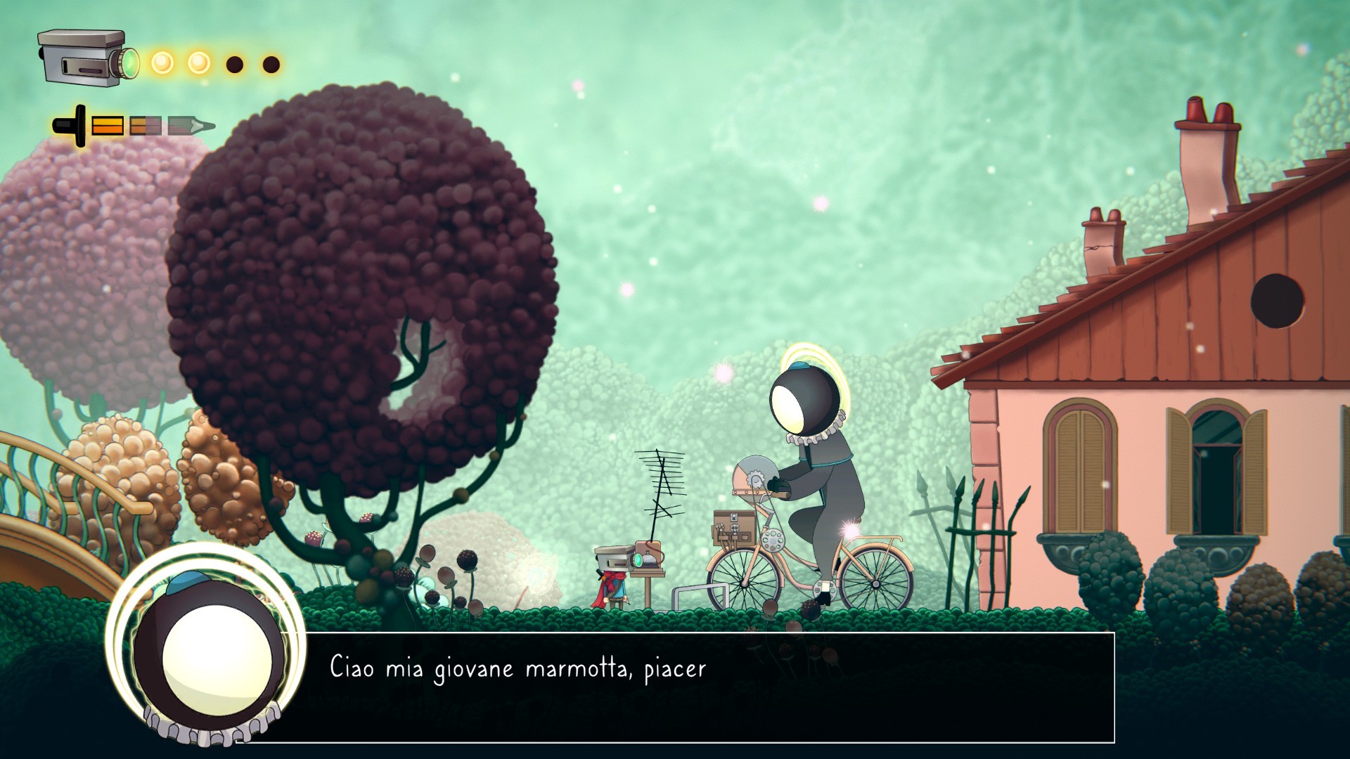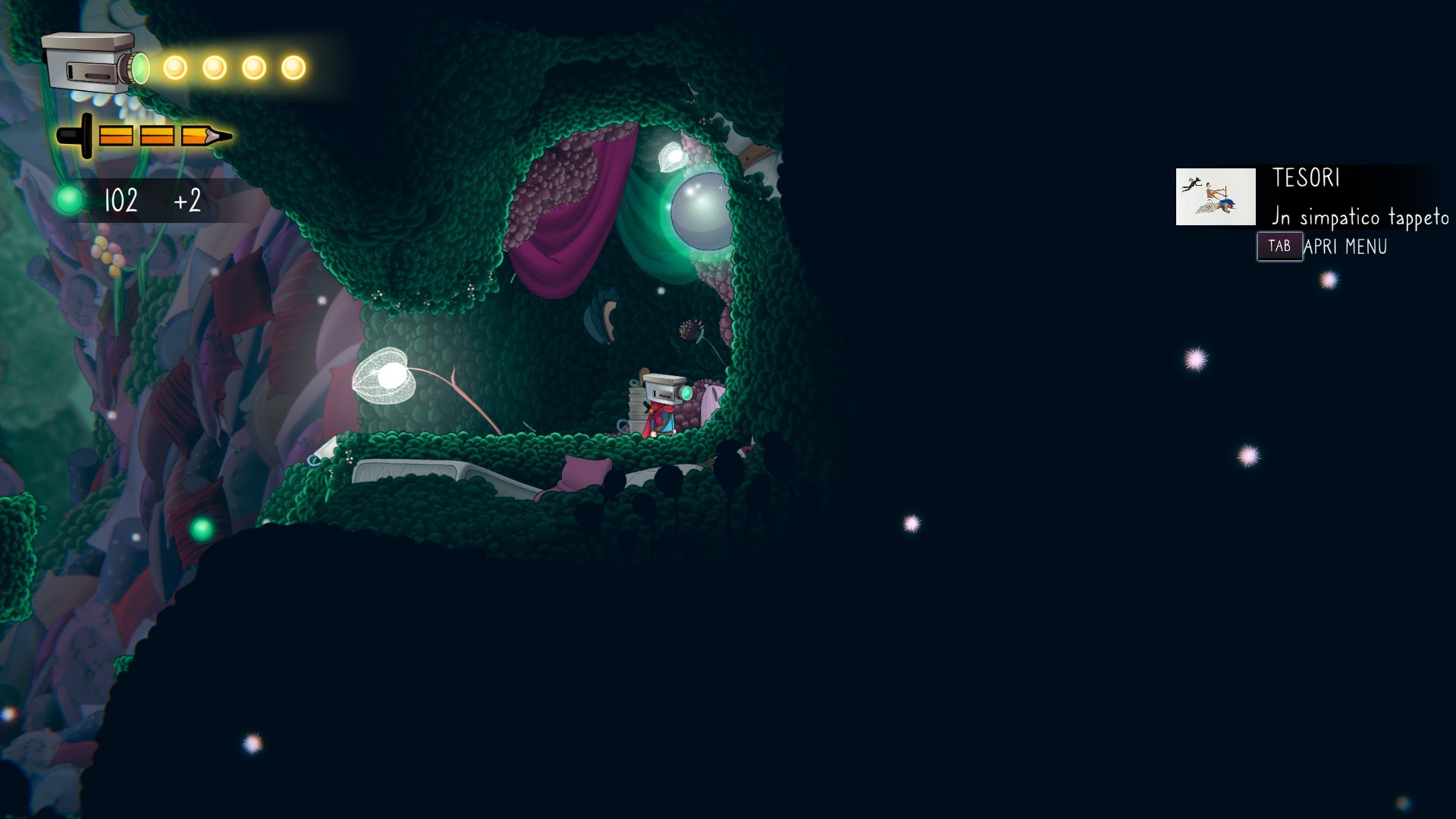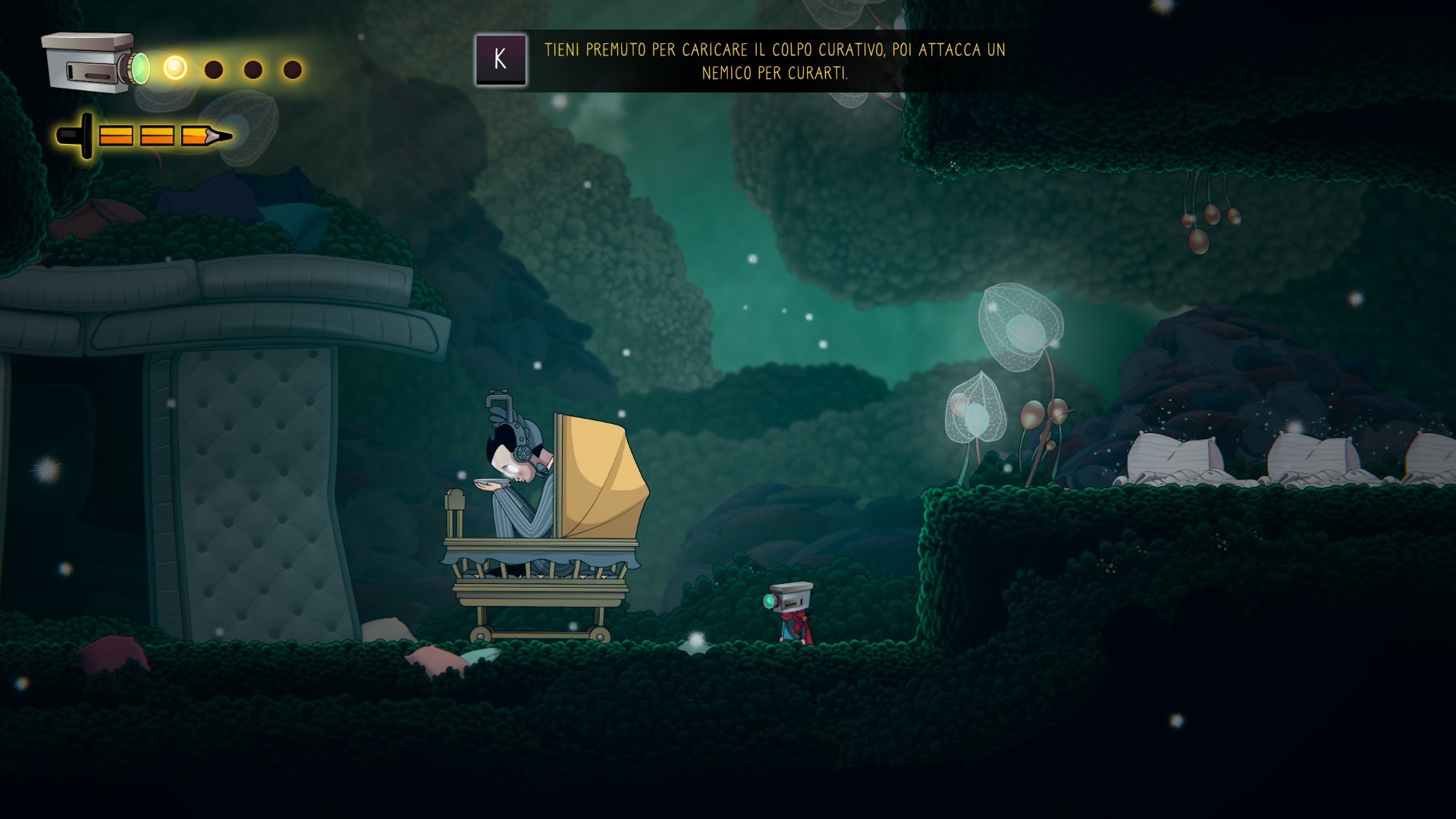 Molto interessante l'idea degli indovinelli che ci svelano punti nascosti - anche al radar dello scanner - da rivelare per sbloccare nuove risorse e collezionabili. Carina la scatola delle medicine che si apre… una volta recuperata la giusta chiave (ehm non vi diciamo come. -NdR). Così come è carina l'idea del ladro che ci ruba alcune Babls (le sfere fluorescenti da usare poi come moneta locale) non appena moriamo e che dovremo recuperare al più presto (fortunatamente non è difficile). Dal menu di pausa poi si accede alle varie opzioni: mappa, inventario, filamenti, tesori e poteri ognuna delle quali occupa (graficamente) uno spazio di un ipotetica videocamera... che poi è la nostra testa. Ci sono, insomma, tanti piccoli spunti carini che misti alle metafore presenti nel gioco agli ambienti ottimamente disegnati e colorati e all'accompagnamento adeguato di una valente colonna sonora, rendono tutto il gioco interessante dall'inizio alla fine.