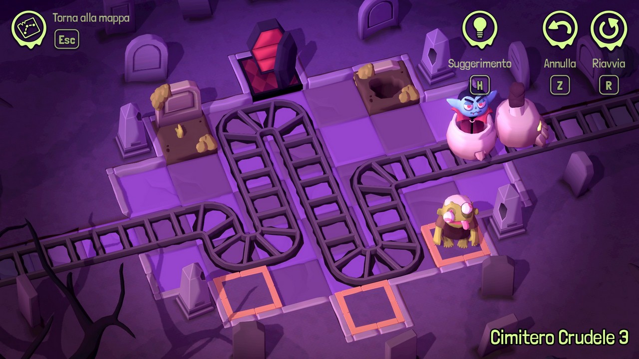 Questa problematica in certi livelli è proprio necessaria per andare avanti: se ad esempio abbiamo 2 vampiri e 2 bambini e 4 bare come destinazione, è chiaro che dovremo far trasformare i bambini in vampiri durante il nostro percorso. Altre volte invece dovremo fare il classico gioco della capra, del lupo e del cavolo: abbiamo il bambino a bordo, dovremo lasciarlo su una piattaforma e caricare un vampiro o uno zombie. Le varianti insomma sono davvero tantissime e il gioco non fa niente per aiutarci, salvo un piccolo suggerimento con la pressione del tasto X del controller che visualizza su schermo l'orientamento dei binari in due celle a caso. Come andare a creare il nostro percorso inglobando quelle due celle poi è affar nostro, quindi suggerimento fino a un certo punto.