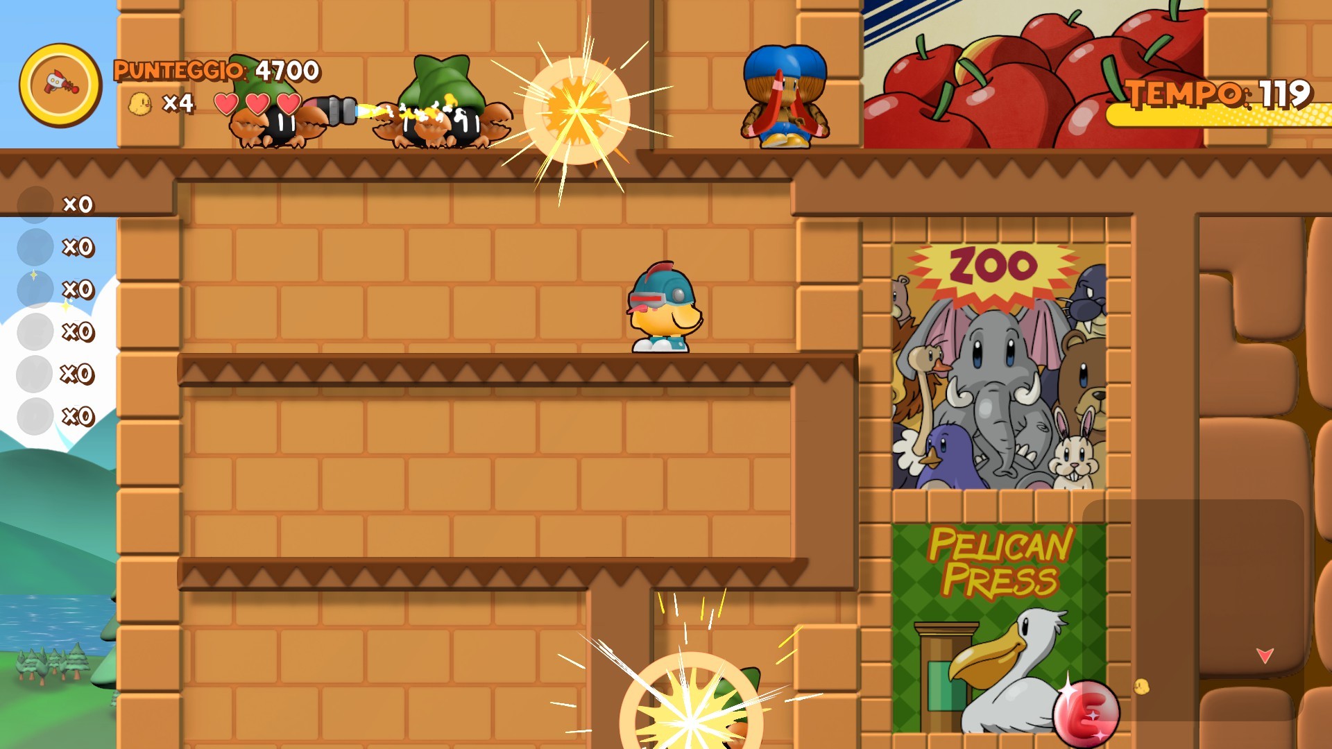 Come dicevamo, Tiki non può volare ma può zompettare da una piattaforma all'altra al limite riducendo il tempo di caduta, ma soprattutto approfittando di tutto ciò che l'ambiente ha da offrire come piattaforme mobili, piccoli aggeggi volanti e perfino veicoli trovati in giro per muoversi il livelli che si espandono in tutti e quattro i punti cardinali e all'interno dei quali trovare gli altri uccelli Kiwi da liberare prima di passare allo stage successivo. In mezzo, naturalmente, ci saranno tante nuove armi da raccogliere e soprattutto potenziamenti che potranno aiutare durante l'avventura. Ogni livello poi sarà completato dal solito, rognosissimo, boss finale che pur utilizzando un leggibilissimo pattern d'attacco metterà a dura prova la nostra abilità.