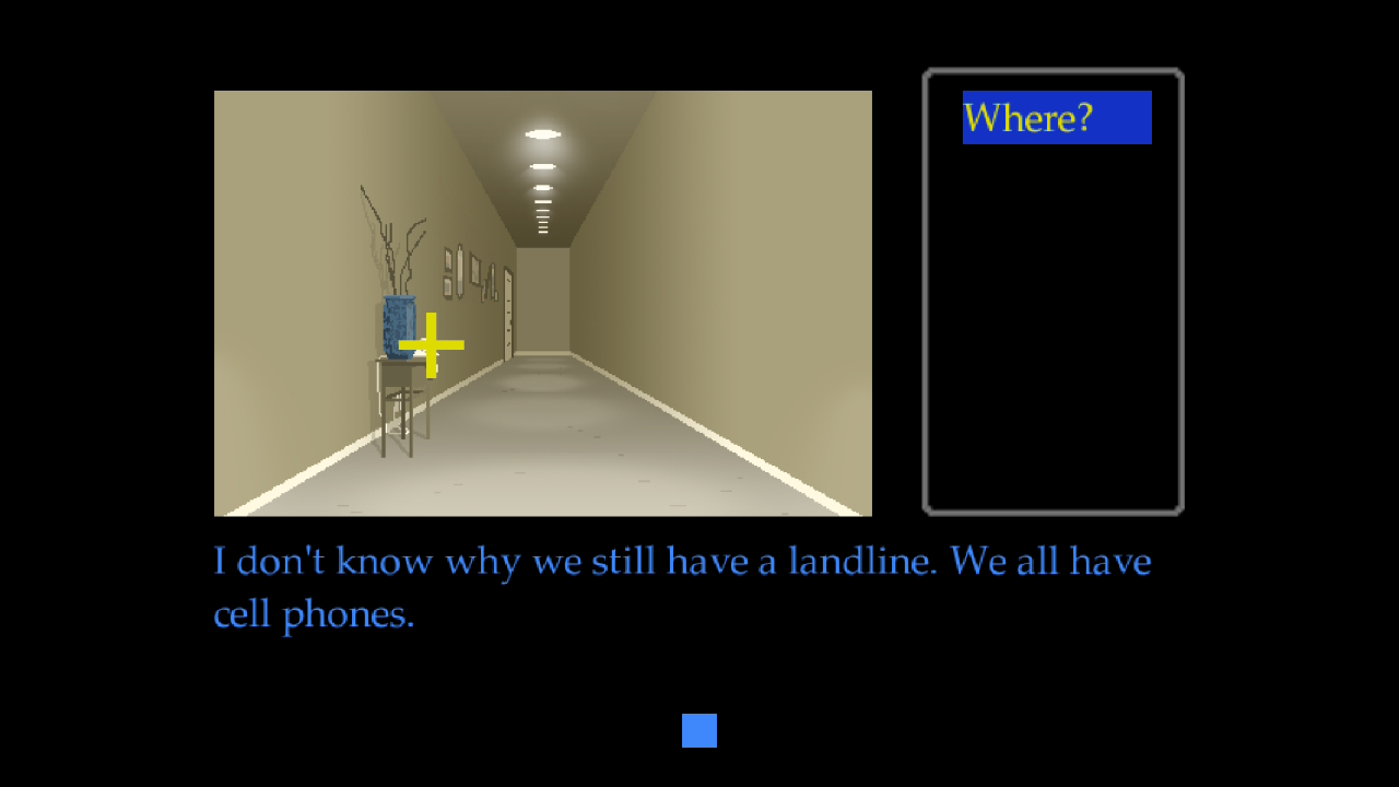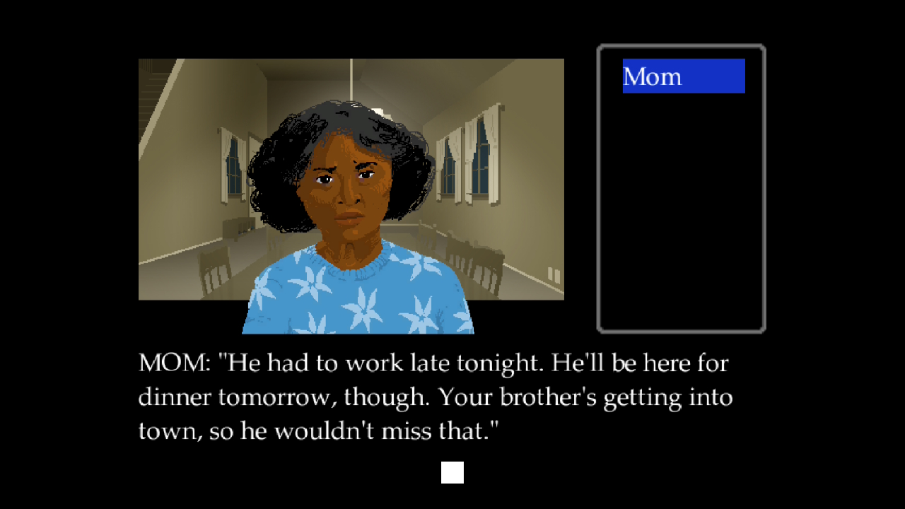 Dopo aver superato la fase del platform di precisione, improvvisamente il gioco cambia genere divenendo una vera e propria avventura grafica in prima persona. Vedremo una schermata, quasi d'altri tempi, semplificata per interagire con l'ambiente tramite dei comandi testuali come Look, Talk, Use e Move. Cominceremo dalla stanza dagli occhi di Maya, scoprendo le abitudini familiari e le sue passioni. Ci muoveremo tra la casa fino alla sala da pranzo, dove la famiglia è riunita per mangiare. Nostra madre sembra avere un comportamento un po' strano, molto insistente e poco naturale.