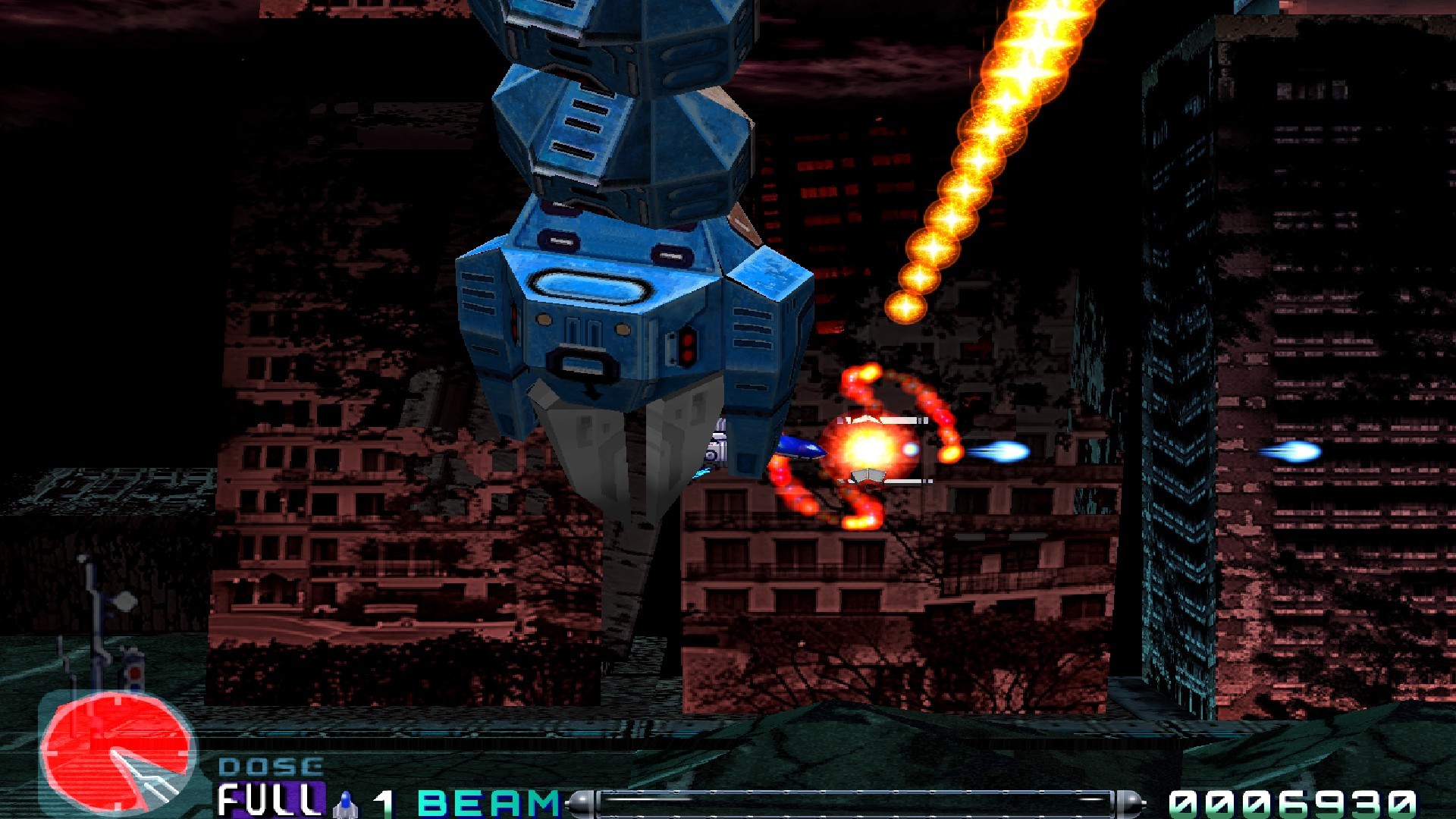 Il Controller (anche quello della Xbox Series X|S va bene, come abbiamo fatto noi) è perfettamente supportato e prevede il tasto X per sparare - RT o B per il fuoco continuo rapido -, il tasto A per gestire il Force, Y per l'arma Delta (quando l'avremo prima caricata) e poi la velocità su e giù con i grilletti sinistri del controller. A nostra disposizione avremo 3 vite e 5 crediti (a livello intermedio), finiti i quali torneremo al menu dei titoli e ci toccherà ricominciare daccapo: ebbene sì, anche se siete arrivati al secondo stage, al restart ripartirete dall'inizio, niente sconti! L'arma Delta (devastante su schermo) sarà utilizzabile quando avremo riempito un contenitore (indicato come DOSE) fino al 100%, principalmente utilizzando il Force come arma distruttrice. Fortunatamente se ci fanno fuori questo contatore non si resetta e quindi ricominceremo con il livello già caricato in precedenza. (e meno male... -NdR)