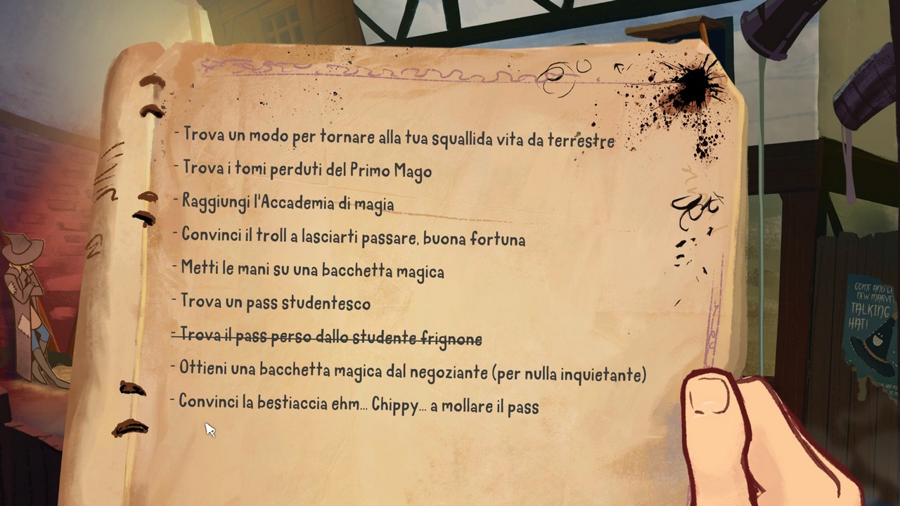 Ci recheremo al vicino villaggio nel tentativo di procurarci la via d'accesso per l'Accademia di Magia del luogo, il posto ideale dal quale partire dato che parliamo comunque di pozioni, incantesimi e compagnia cantante. Nel frattempo incontreremo tantissime persone, alcune messe lì tanto per comparsa (tipo il troll con i fiori o i bambini che giocano in piazza), altri invece importantissimi per proseguire nella storia, tutti ottimamente caratterizzati. Pur facendo di tutto per evitare fastidiosi spoiler (e non è semplice) non si può non citare lo strano oste della locanda Bloated Goat Inn, l'ancor più ambiguo prete della chiesa, il curiosissimo Paludoso per non parlare del misterioso Mundus' Magic Shop, un negozio che sembra preso in prestito da Safarà (di Dylan Dog) e gestito da una strana marionetta animata da un polpo. Personaggi, comunque, per buona parte già noti a chi ha seguito poi tutta la saga di Simon the Sorcerer.