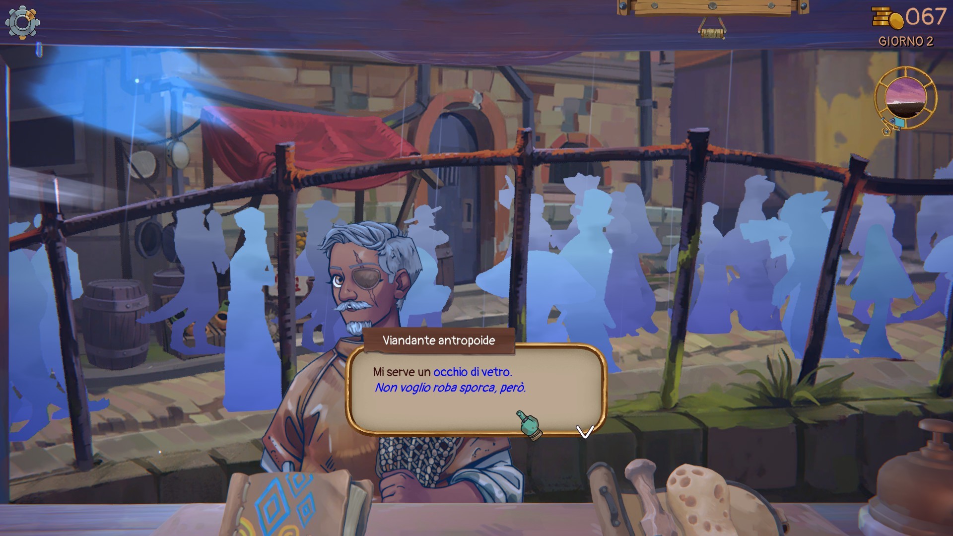 I clienti sono stranissimi, tutti assolutamente abitanti di un mondo fantasy e torneranno più volte raccontandoci di volta in volta la loro piccola storia e contribuendo così a una caratterizzazione che a lungo andare si delineerà sempre meglio. Come dicevamo verranno a fare la loro richiesta e poi aspetteranno allo sportello oppure andranno via in attesa che li richiamiamo noi stessi. Ad un certo punto poi Aimon ci da a disposizione un carretto per spostarci nei mercatini esterni, ma solo in determinati giorni e dietro il pagamento di una piccola somma. Le sortite sono molto utili per svuotare il nostro registro dei tesori, rimpinguare la nostra riserva di monete e anche per accaparrare nuovi clienti che poi potremo anche far venire direttamente alla bottega. Quando l'oggetto sarà pronto potremo venderglielo al prezzo consigliato oppure fare anche uno sconto che servirà a far migliorare la nostra reputazione e a fidelizzare meglio il cliente.