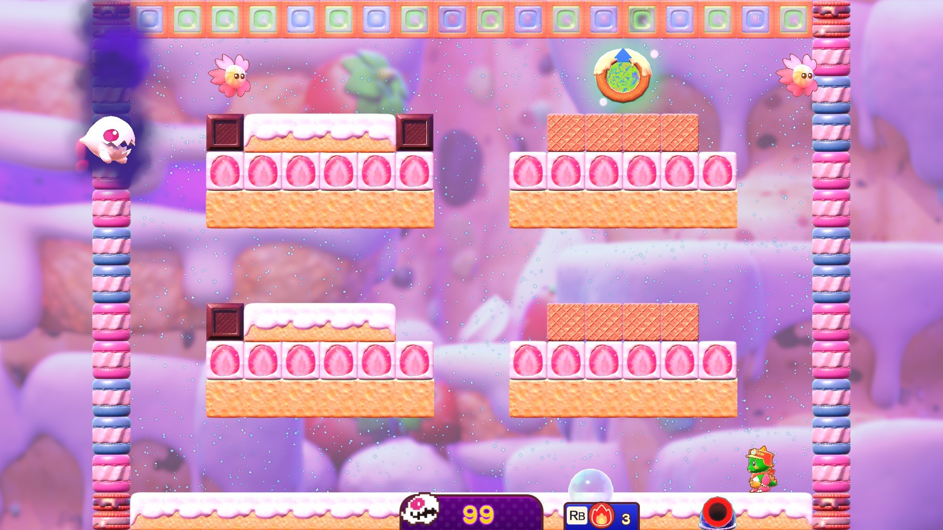 Il gioco originale era caratterizzato anche dagli importantissimi power-up che, una volta raccolti su schermo, ci davano delle abilità temporanee in grado di agevolarci, e di molto, l'esistenza. Tutti ricorderanno le velocissime scarpette rosse, oppure gli ombrelli per saltare direttamente il livello, o ancora i vari amuleti che ci permettevano di sparare le bolle più velocemente e così via. Adesso non c'è nulla di tutto questo, salvo un forziere gigante che compare di tanto in tanto permettendo di accumulare monete da spendere per poi acquisire potenziamenti temporanei, come delle bolle elementali in grado di far fuori determinati tipi di nemici.
